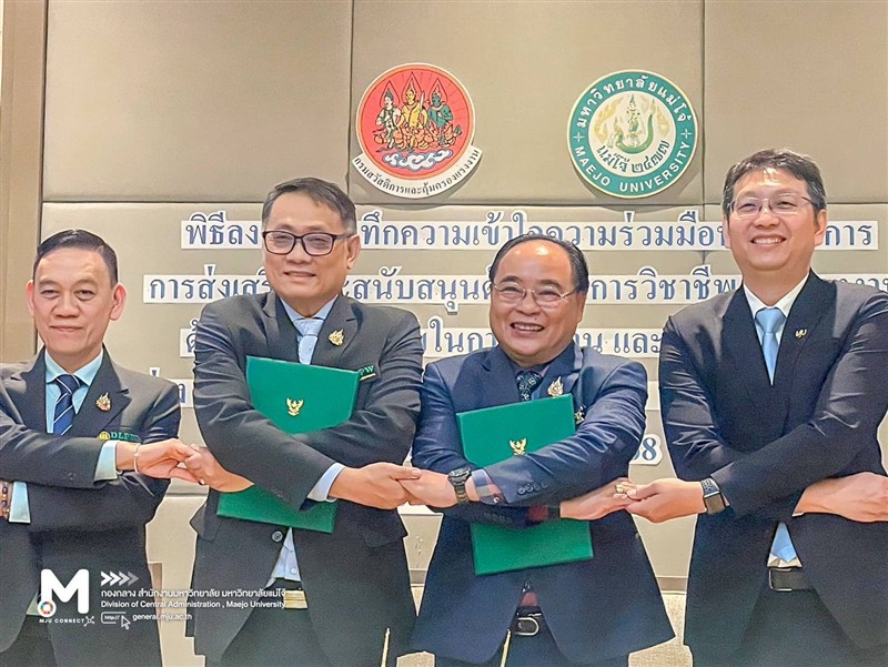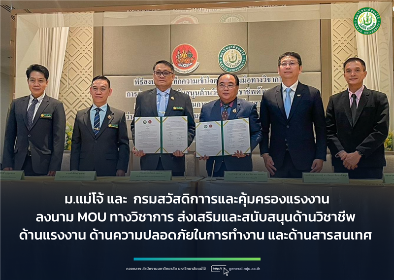 วันศุกร์ที่ 10 ตุลาคม 2568 ที่ โรงแรม เอส ดี อเวนิว บางพลัด กรุงเทพมหานคร มหาวิทยาลัยแม่โจ้เข้าร่วมพิธีลงนามบันทึดความเข้าใจความร่วมมือทางวิชาการ (MOU) ร่วมกับ กรมสวัสดิการและคุ้มครองแรงงาน กระทรวงแรงงาน โดยได้รับเกียรติจาก รองศาสตราจารย์ ดร.วีระพล ทองมา อธิการบดีมหาวิทยาลัยแม่โจ้ และ เรือเอก สาโรจน์ คมคาย อธิบดีกรมสวัสดิการและคุ้มครองแรงงาน (กสร.) เป็นผู้แทนลงนามทั้งสองฝ่าย และมี นายศักดิ์ศิลป์ ตุลาธร รองอธิบดี กสร. รองศาสตราจารย์ ดร.ชัยยศ สัมฤทธิ์สกุล รองอธิการบดี , รองศาสตราจารย์ ดร.สมเกียรติ ชัยพิบูลย์ คณบดีคณะสารสนเทศและการสื่อสาร , นายทวีสิทธิ์ บุญธรรม ผู้บริหารกองความปลอดภัยแรงงาน กสร. ร่วมลงนามเป็นสักขีพยาน รวมทั้งมีคณะผู้บริหาร บุคลากรกร ทั้ง 2 หน่วยงานเข้าร่วมเป็นเกียรติในพิธี