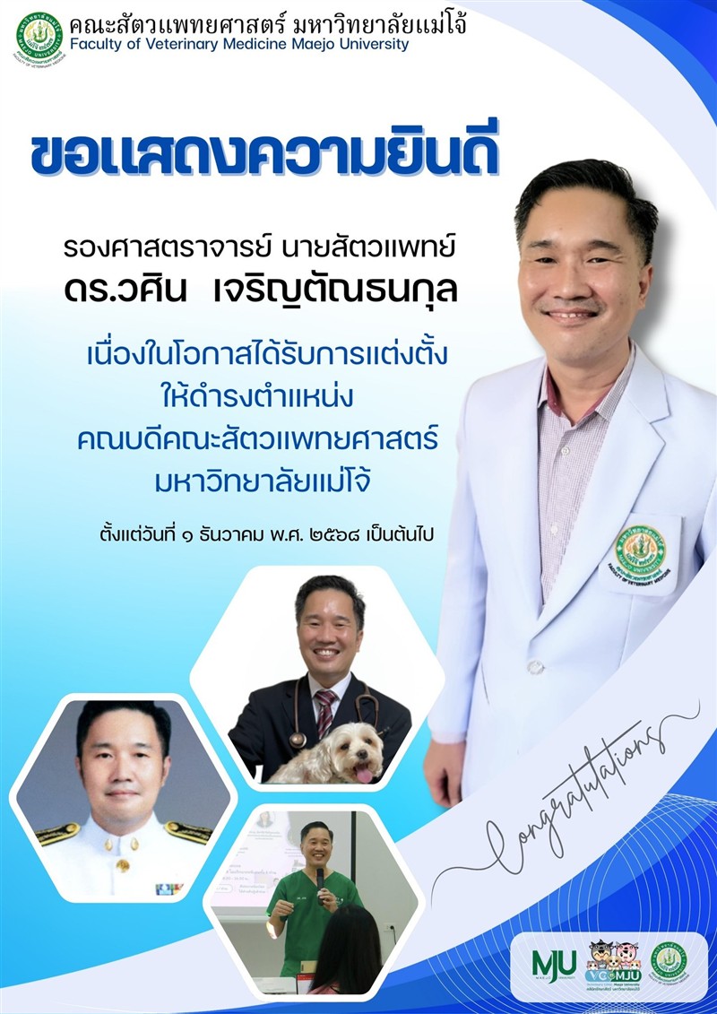 รองศาสตราจารย์ นายสัตวแพทย์ ดร.วศิน เจริญตัณธนกุล ดำรงตำแหน่ง คณบดีคณะสัตวแพทยศาสตร์