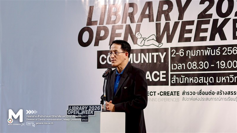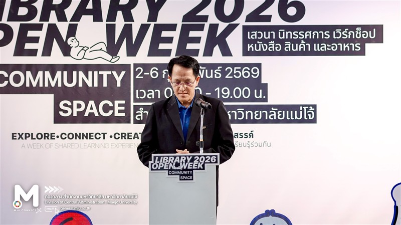 วันจันทร์ที่ 2 กุมภาพันธ์ 2569 สำนักหอสมุดมหาวิทยาลัยแม่โจ้ จัดงาน Library Open Week 2026 ภายใต้แนวคิด “EXPLORE • CONNECT • CREATE — A Week of Shared Learning Experiences” (สำรวจ • เชื่อมต่อ • สร้างสรรค์ — สัปดาห์แห่งประสบการณ์การเรียนรู้ร่วมกัน) โดยได้รับเกียรติจาก รองศาสตราจารย์ ดร.เกรียงศักดิ์ ศรีเงินยวง รองอธิการบดีเป็นประธานในพิธีเปิดงาน และ นางอริศรา สิงห์ปัน ผู้อำนวยการสำนักหอสมุด กล่าวรายงานการจัดงาน